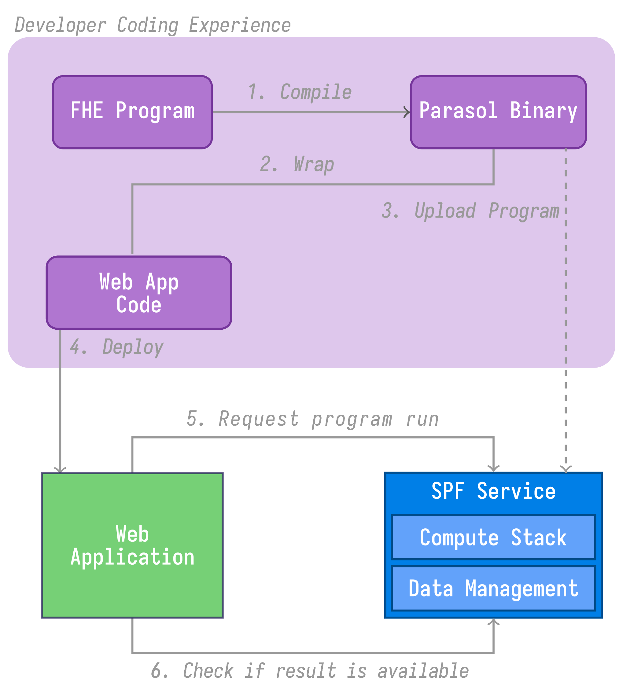 This section describes the process of creating, deploying, and running programs with SPF in both web2 and web3 environments. The developer experience is largely similar across both ecosystems, with the primary differences being how program runs are initiated and how results are decrypted. This section covers the high level workflow, while detailed information about SPF service endpoints and the smart contract library is provided in later sections.