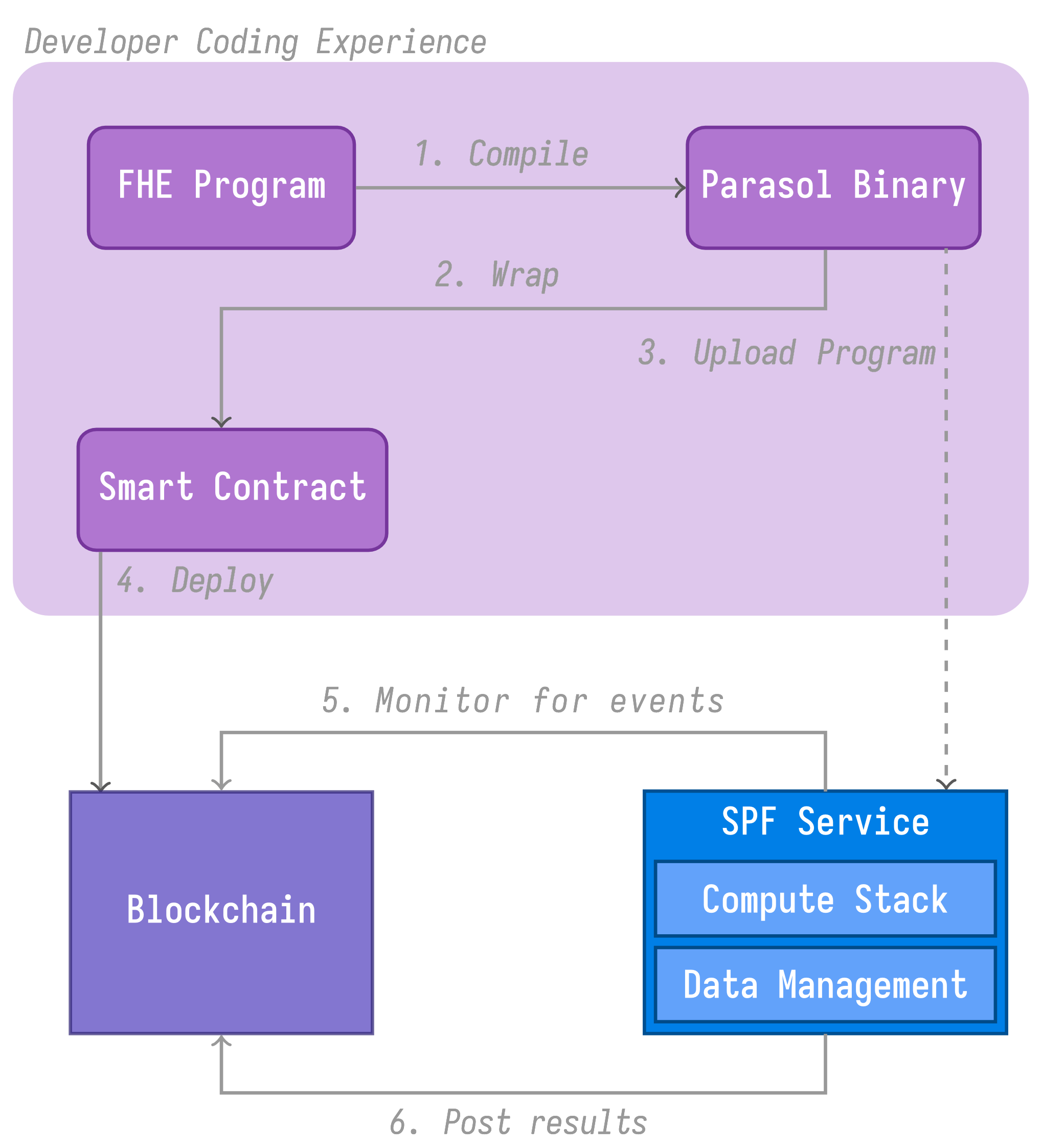 The SPF design enables developers to bring FHE directly to applications on any chain without requiring migration to a new chain, L2, or rollup. This architecture maintains a similar developer workflow for both web2 and web3 environments, as most blockchains are not designed to handle FHE operations directly on-chain.